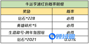 有团就有聚,开年开好局。登录游戏即可领取拜年大礼:牛运亨通头像框*1+牛运亨通红包*1(限时生涯称号*1+保底288钻石+英雄碎片*5,有机会开出2021钻石)+荣耀积分*90+牛运亨通局内特效体验礼*1