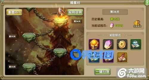 玩家上阵3名英雄,与关卡的3名boss同场PK,在1分半内获胜则通关。通关后会获得秘籍经验图、试炼石、大罗金丹、秘籍等奖励,试炼石可以在摘星商店中兑换其他道具物品。已经通关的关卡当天内不可以重复挑战。每次重置后,可以使用“一键扫荡”功能来快速通关个人历史最高的层数并获取大量奖励。每天00:00系统会将副本重置,VIP10以上玩家可购买额外重置次数。