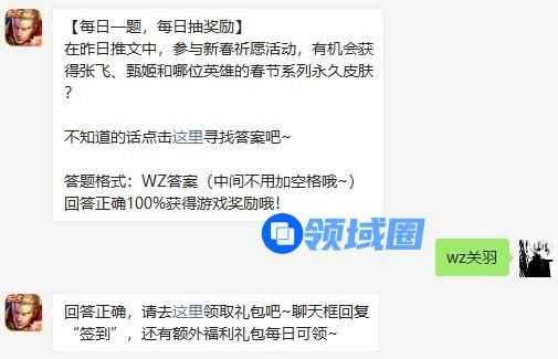 【每日一题,每日抽奖励】在昨日推文中,参与新春祈愿活动,有机会获得张飞、甄姬和哪位英雄的春节系列永久皮肤?不知道的话点击这里寻找答案吧~答题格式:WZ答案(中间不用加空格哦~)回答正确100%获得游戏奖励哦!