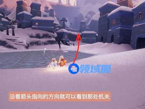 3、沿着图中箭头的指向来到房屋中,找到前往日落竞技场的缆车机关;