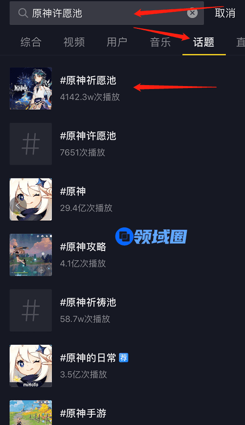 进入抖音后,点击右上角的搜索按钮。打上“原神祈愿池”搜索,然后再点击话题,就会看到原神祈愿池活动了。