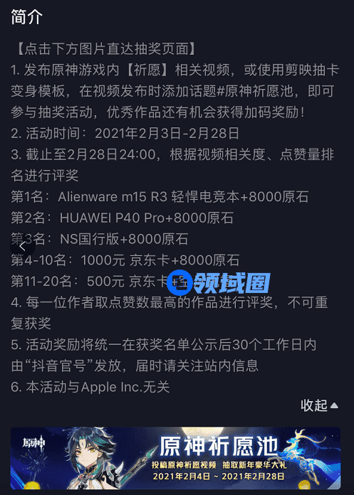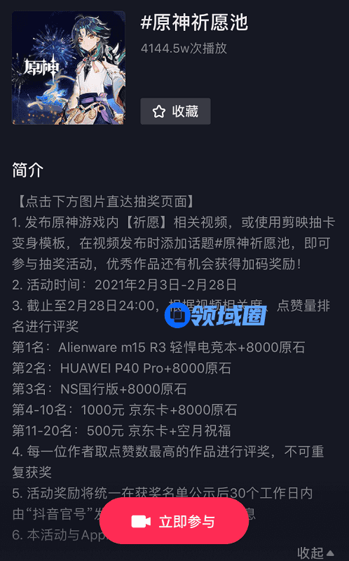 1,发布原神游戏内【祈愿】相关视频,或使用剪映抽卡变身模板,在视频发布时添加话题#原神祈愿池,即可参与抽奖活动,优秀作品还有机会获得加码奖励!