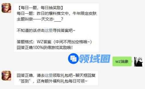 【每日一题,每日抽奖励】每日一题:昨日的爆料推文中,牛年限定皮肤主题叫做——天文志·____?不知道的话点击这里寻找答案吧~答题格式:WZ答案(中间不用加空格哦~)回答正确100%获得游戏奖励哦!
