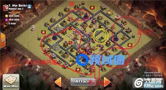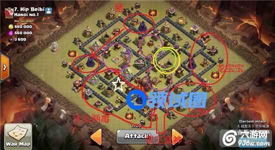 先在6点下四天使女王,7点暗黑采集器开墙,女王开大干掉对方女王,配合两毒药灭对方援兵,然后4点下石法,清完外层建筑后炸弹开墙,下武神男王开墙进入内部,紧跟狂暴回复弹跳,箭塔被吸引后,三点放龙宝宝。