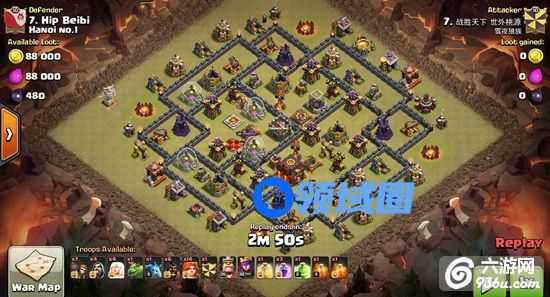 女王这边,清完8,9点的建筑后,预计会射墙进入对方男王区域,(余光)发现女王血量不足或急剧下降时及时下狂暴覆盖天使及女王,最后12点下猪收尾。