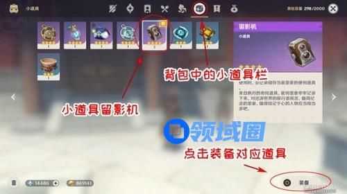 顾名思义,这个小道具是用来照相的。获取该奖励后进入背包,点开小道具栏,即可从中选择装备留影机。