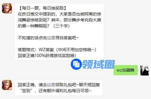 【每日一题,每日抽奖励】在昨日推文中提到的,大家是否也被阿离的惊鸿舞姿惊艳到呢?其中,部分舞步考究自大唐的哪一种舞蹈呢?(三个字)不知道的话点击这里寻找答案吧~答题格式:WZ答案(中间不用加空格哦~)回答正确100%获得游戏奖励哦!