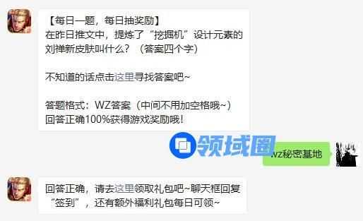 【每日一题,每日抽奖励】在昨日推文中,提炼了“挖掘机”设计元素的刘禅新皮肤叫什么?(答案四个字)不知道的话点击这里寻找答案吧~答题格式:WZ答案(中间不用加空格哦~)回答正确100%获得游戏奖励哦!