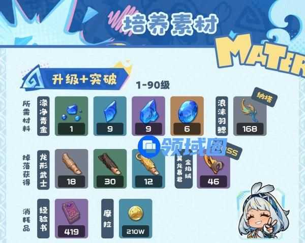 培养材料:摩拉、涤净青金碎屑、受祝所缚之印、卫从的木哨、涤净青金块、浪沫羽鳃、龙冠武上的金哨。