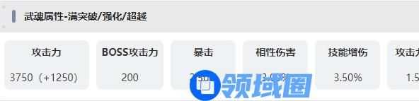 攻击力:3750(+1250)、BOSS攻击力:200、暴击:2.50%、相性伤害:3.00%。