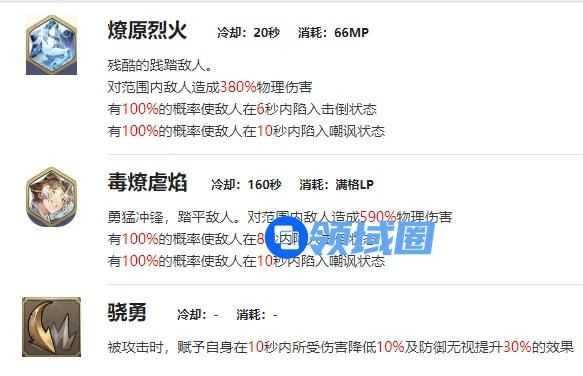 燎原烈火:可以给攻击范围内的目标造成380%物理伤害。