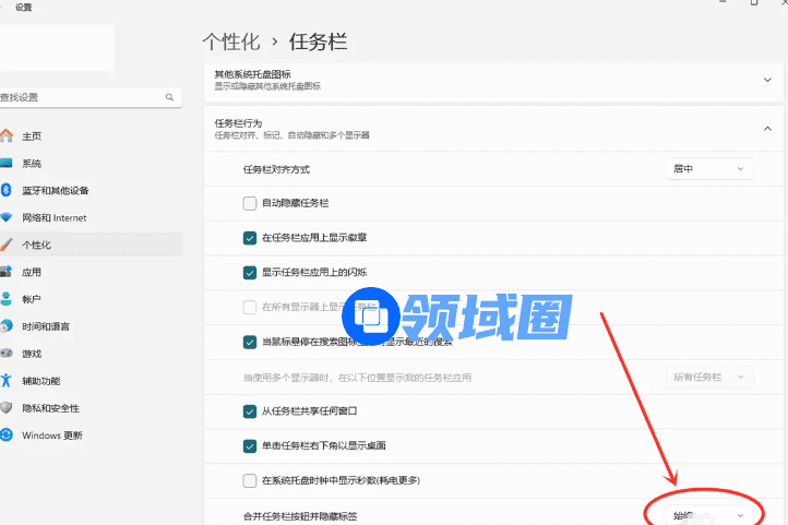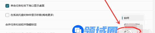 2、在任务栏设置页,找到“合并任务栏按钮并隐藏标签”选项,点击右侧下拉菜单。