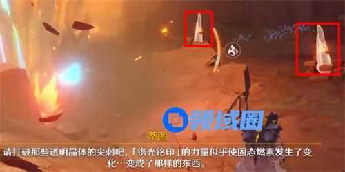 2、跟随蒂图来到小缝影针处,变身为峭锋龙击碎地上和墙壁上的透明晶体尖刺。
