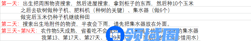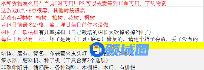 前期主要是在左办公区种菜。有花草树木后,做萤火虫头灯,搜房挖洞。后期树木多了,菜园就可以废弃了!树木可以为你提供所有的生命来源和一些小动物,具体如图所示
