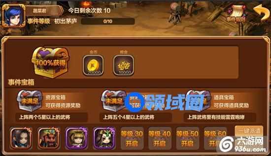 除了是固定的100%宝箱之外,玩家还有机会获得事件宝箱。获得事件宝箱需要满足不同要求。比如上阵两个5星以上的武将、上阵王公称号的武将等等。不过这里有一点要注意,已经派遣的武将不能用于另一个任务。所以如果未来开启的事件越多,对武将的数量要求也会随之增加哦。这就要求玩家多多参与酒馆招募武将,或者通过副本翻牌、精彩活动领取的方式收集武将。
