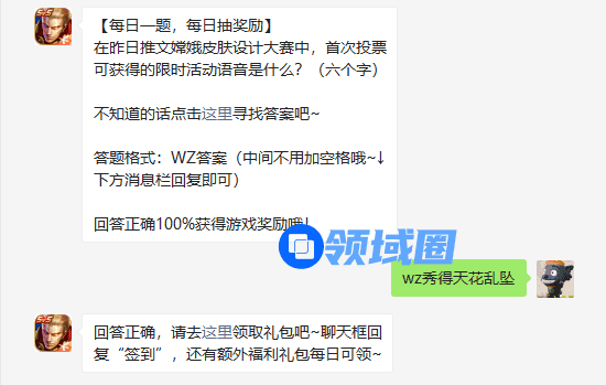 【每日一题,每日抽奖励】在昨日推文嫦娥皮肤设计大赛中,首次投票可获得的限时活动语音是什么?(六个字)不知道的话点击这里寻找答案吧~答题格式:WZ答案(中间不用加空格哦~↓下方消息栏回复即可)回答正确100%获得游戏奖励哦!