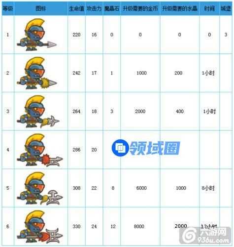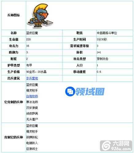 蓝皮巨魔等级为1时 ,其生命值为220,攻击力为16,生产时不需要魔晶石,但必须在城堡等级为3级时才能生产。