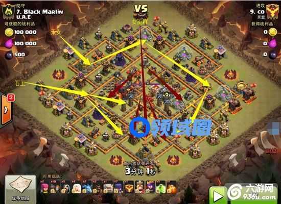 首先前戏还是由天女来完成,女巫流的天女死亡概率几乎为零,如果思路好的话蛮王也有存活的几率,女王滑步清理阵边缘的防御,女巫则是趁机攻入阵心,最后蛮、女、巫三路夹击拿下三星!