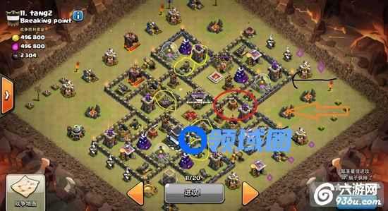 图中的红圈就是地震要放的位置,这样我们可以一举杀掉他的双王 援军 ,且空地较多可以踩掉陷阱。 而黄圈则是我们武神前戏部队进去以后需要拉住的火力,给后面野猪部队减轻压力。