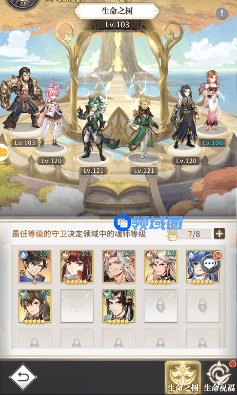 生命之树可以说是一个等级共享系统,等级最高的6位魂师会自动定位成生命之树的守卫,最低等级的守卫将决定生命之树的等级。底下的位置是领域位置,放进领域的魂师将共享获得生命之树的等级,星级保持不变。