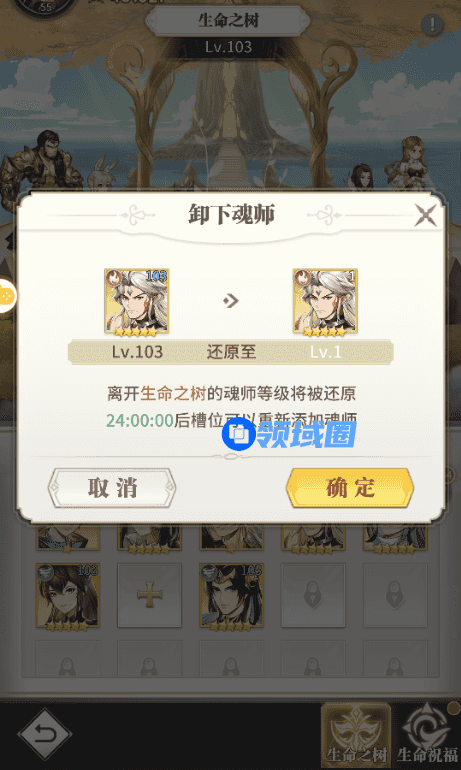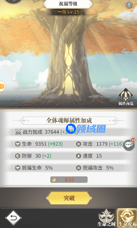 3、当生命之树达到250级后,可以进行等级突破,将6名守护魂师放入领域中,每个12星魂师都可以提升生命之树5级的等级上限。