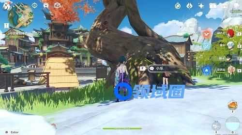 2、在传送锚点后面的大树后,小乐就躲在树后。