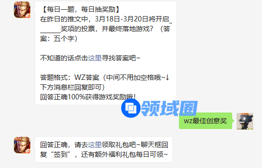【每日一题,每日抽奖励】在昨日的推文中,3月18日-3月20日将开启________奖项的投票,并最终落地游戏?(答案:五个字)不知道的话点击这里寻找答案吧~答题格式:WZ答案(中间不用加空格哦~↓下方消息栏回复即可)回答正确100%获得游戏奖励哦!