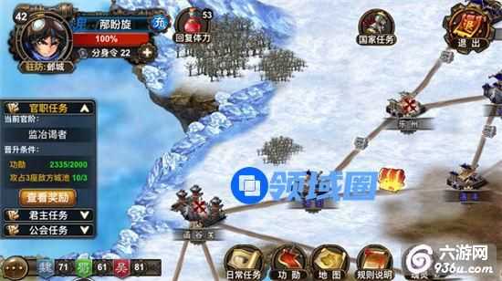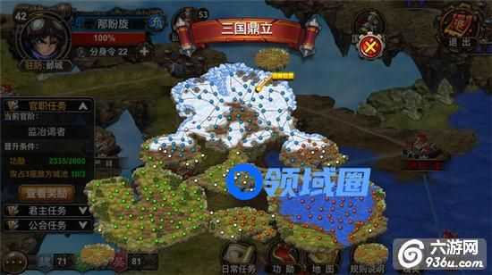 《机甲无双》到达18级时开启“国战”玩法,点击界面右侧的国战按钮即可进入国战地图。国家阵营是在创建账号时选择的,后期不可更改。总共有255座城池分散在大地图上,分别被魏国(蓝色)、蜀国(绿色)和吴国(红色)的守卫军所把守,玩家的目标是攻占敌方城池并保护己方城池。