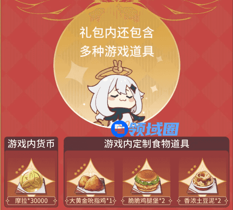 还包含有:摩拉30000、大黄金吮指鸡、脆脆鸡腿堡、香浓土豆泥