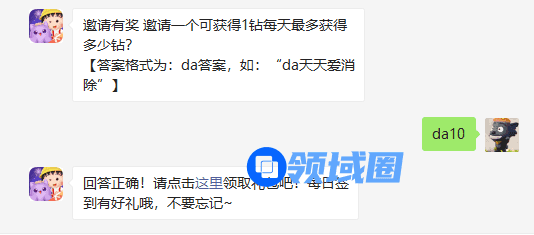 邀请有奖 邀请一个可获得1钻每天最多获得多少钻?【答案格式为:da答案,如:“da天天爱消除”】这是天天爱消除3月10日每日一题题目,游戏宝小编为您带来邀请有奖邀请一个可获得1钻每天最多获得多少钻答案。