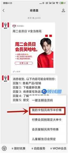 首先关注‘肯德基’的微信公众号,点击右下角 “WOW会员”-“我的卡包”一项。