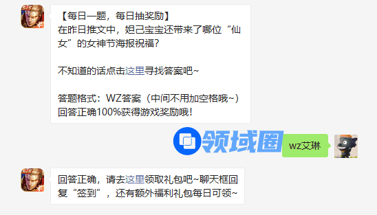 【每日一题,每日抽奖励】在昨日推文中,妲己宝宝还带来了哪位“仙女”的女神节海报祝福?不知道的话点击这里寻找答案吧~答题格式:WZ答案(中间不用加空格哦~)回答正确100%获得游戏奖励哦!