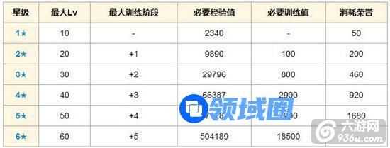 各星级升级到下一星级所需要的经验值/训练值/荣誉如下: