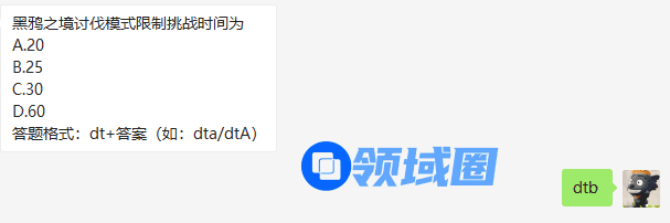 黑鸦之境讨伐模式限制挑战时间为A.20B.25C.30D.60答题格式:dt+答案(如:dta/dtA),玩家需要选择正确答案才能获得奖励,游戏宝小编为您带来为您带来正确答案选择。