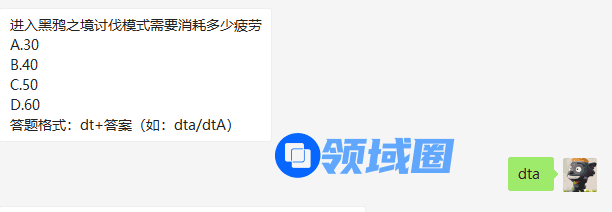 进入黑鸦之境讨伐模式需要消耗多少疲劳A.30B.40C.50D.60答题格式:dt+答案(如:dta/dtA),游戏宝小编为您带来进入黑鸦之境讨伐模式需要消耗多少疲劳答案分享。