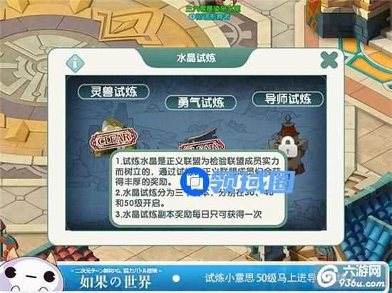 灵兽试炼勇气试炼和导师试练是正义联盟为验成员实力而设立的哦!灵兽试炼是正义联盟为新兵所准备的福利,挑战成功的勇士们不仅可以得到经验和活跃度,还会得到宠物技能收纳箱和宠物的生长激素哦!快用它们来增强你们的宠物吧!勇气试炼则是需要勇士达到40级以上才可以挑战的哦,不过挑战成功的勇士能够得到伙伴技能收纳箱和大量的经验哦!导师试炼是正义联盟的终极试炼,可以说能够得到导师的认可,是每个正义联盟成员所期待的。能够成功通过试炼的小伙伴们得到的奖励自然也不会少,除了活跃度和经验之外,还会掉落白色魔晶、精炼之尘和精炼卷轴呢!