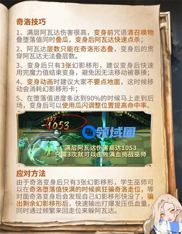 奇洛有两种形态,普通形态用来叠瓜和叠堕落值准备变身,黑魔王形态用来爆发输出,瓜层数越多伤害越高,但是只有3张瞬移卡不宜乱动。