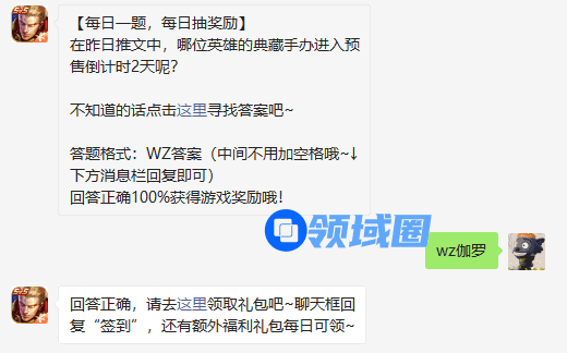 【每日一题,每日抽奖励】在昨日推文中,哪位英雄的典藏手办进入预售倒计时2天呢?不知道的话点击这里寻找答案吧~答题格式:WZ答案(中间不用加空格哦~↓下方消息栏回复即可)回答正确100%获得游戏奖励哦!