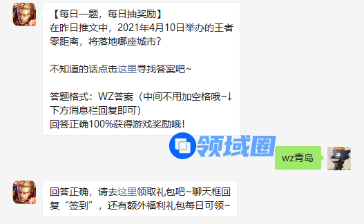 【每日一题,每日抽奖励】在昨日推文中,2021年4月10日举办的王者零距离,将落地哪座城市?不知道的话点击这里寻找答案吧~答题格式:WZ答案(中间不用加空格哦~↓下方消息栏回复即可)回答正确100%获得游戏奖励哦!