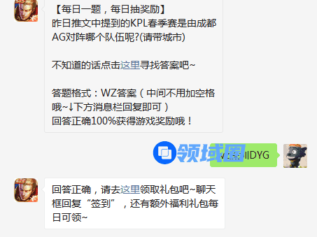 【每日一题,每日抽奖励】昨日推文中提到的KPL春季赛是由成都AG对阵哪个队伍呢?(请带城市)不知道的话点击这里寻找答案吧~答题格式:WZ答案(中间不用加空格哦~↓下方消息栏回复即可)回答正确100%获得游戏奖励哦!