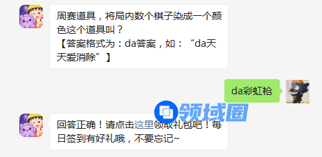 周赛道具,将局内数个棋子染成一个颜色这个道具叫?【答案格式为:da答案,如:“da天天爱消除”】游戏宝小编为您带来天天爱消除3月27日每日一题答案。