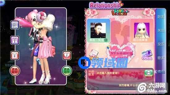 成为好友或者密友后,通过养成“友好度”或“亲密值”,可以申请成为“情侣”喔!成为“情侣”后,通过结婚,开启夫妻系统!成为夫妻后,不仅可以更换对方的专属昵称,还能设定专属动作呢!哦,对了!还有神秘的“情侣奖励”可以领取喔!当“婚龄等级”提升后,还能解锁专属的合成服装呢!心动不如行动,快去寻找让你心动的Ta吧!