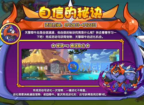 天擎犀牛总是自信满满,他自信的秘诀究竟是什么呢?快去看看学习一下吧!完成活动可获得宠物:天擎犀牛的进化机会。