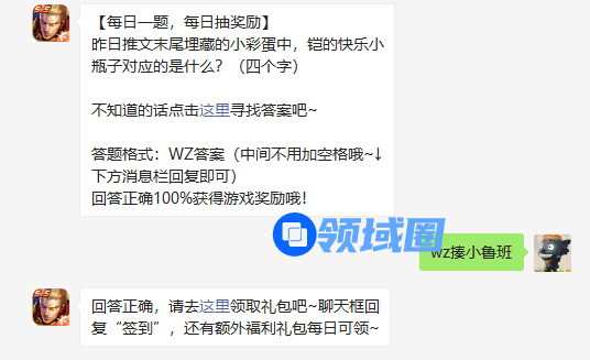 【每日一题,每日抽奖励】昨日推文末尾埋藏的小彩蛋中,铠的快乐小瓶子对应的是什么?(四个字)不知道的话点击这里寻找答案吧~答题格式:WZ答案(中间不用加空格哦~↓下方消息栏回复即可)回答正确100%获得游戏奖励哦!