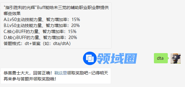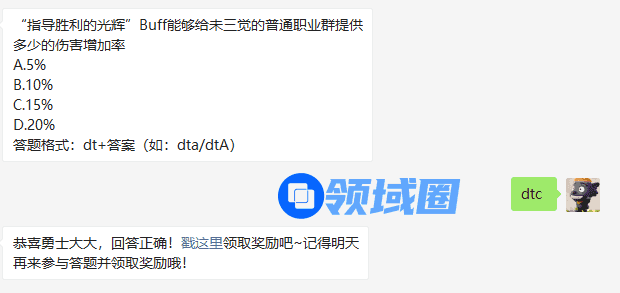 “指导胜利的光辉”Buff能够给未三觉的普通职业群提供多少的伤害增加率A.5%B.10%C.15%D.20%答题格式:dt+答案(如:dta/dtA),游戏宝小编为您带来“指导胜利的光辉”Buff能够给未三觉的普通职业群提供多少的伤害增加率答案分享。