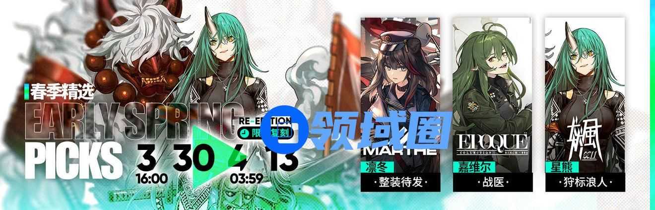 03月30日 16:00 - 04月09日 03:59期间【傀影】、【巫恋】、【刻刀】、【铸铁】、【W】、【温蒂】、【极境】活动关卡信赖获取提升三、春季精选,限时复刻活动时间:03月30日 16:00 - 04月13日 03:59