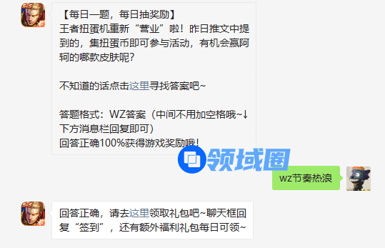【每日一题,每日抽奖励】王者扭蛋机重新“营业”啦!昨日推文中提到的,集扭蛋币即可参与活动,有机会赢阿轲的哪款皮肤呢?不知道的话点击这里寻找答案吧~答题格式:WZ答案(中间不用加空格哦~↓下方消息栏回复即可)回答正确100%获得游戏奖励哦!