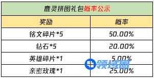 【鹿灵拼图礼包】:打开后可随机获得以下奖励之一:钻石*5、铭文碎片*5、英雄碎片*1、亲密玫瑰*1。