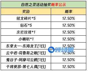 参与抽奖可随机获得下列奖励之一:东皇太一-东海龙王(1日)、云中君-荷鲁斯之眼(1日)、鬼谷子-阿摩司公爵(1日)、干将莫邪-第七人偶(1日)、小喇叭*1、亲密玫瑰*1、铭文碎片*5、钻石*5。