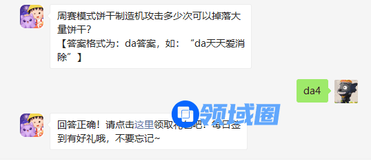 周赛模式饼干制造机攻击多少次可以掉落大量饼干?【答案格式为:da答案,如:“da天天爱消除”】这是天天爱消除3月23日每日一题,游戏宝小编为您带来周赛模式饼干制造机攻击多少次可以掉落大量饼干答案分享。